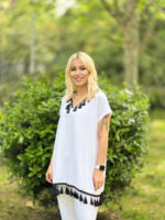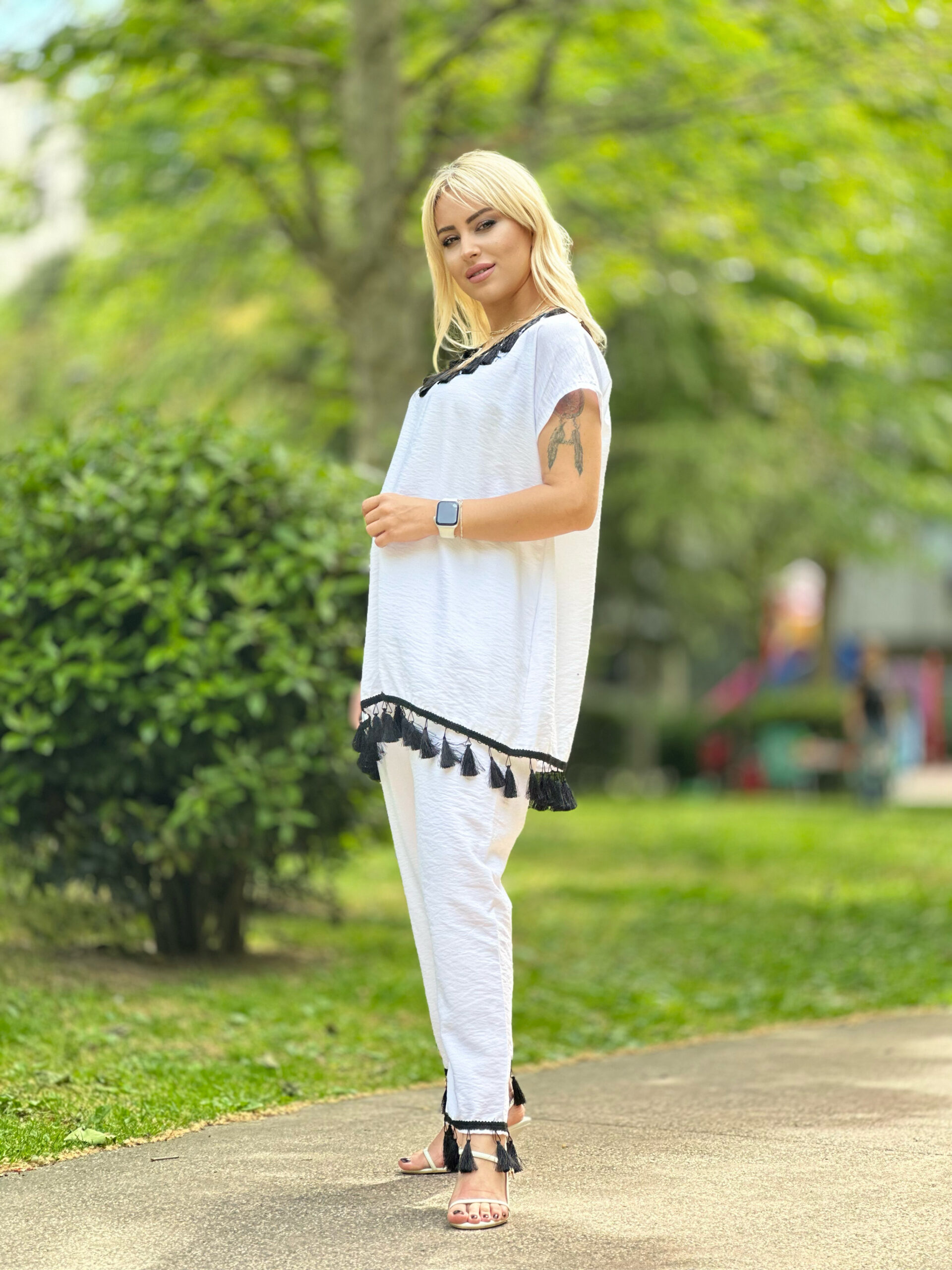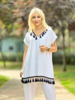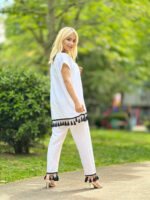 Beyaz Püsküllü Saten Tunik Takım